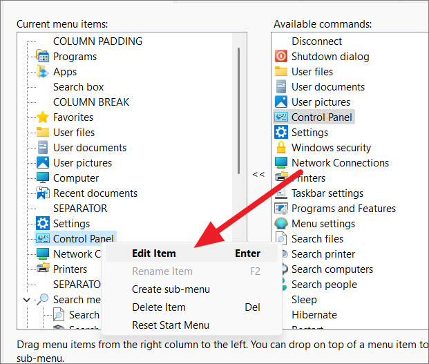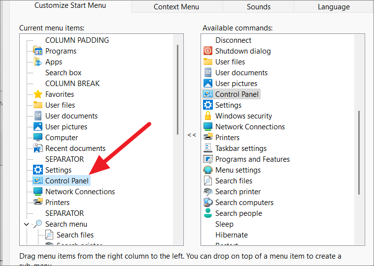 For example, to add ‘Control Panel’ below ‘Settings’, select ‘Settings’ in the left column, find ‘Control Panel’ in the right column, and double-click it.