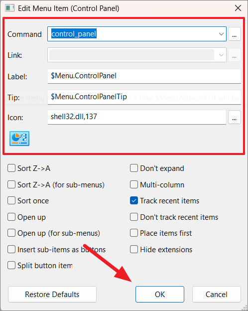 In the Edit Menu Item dialog, you can modify various properties such as the command, label, icon, and tooltip. Click ‘OK’ to save your changes.