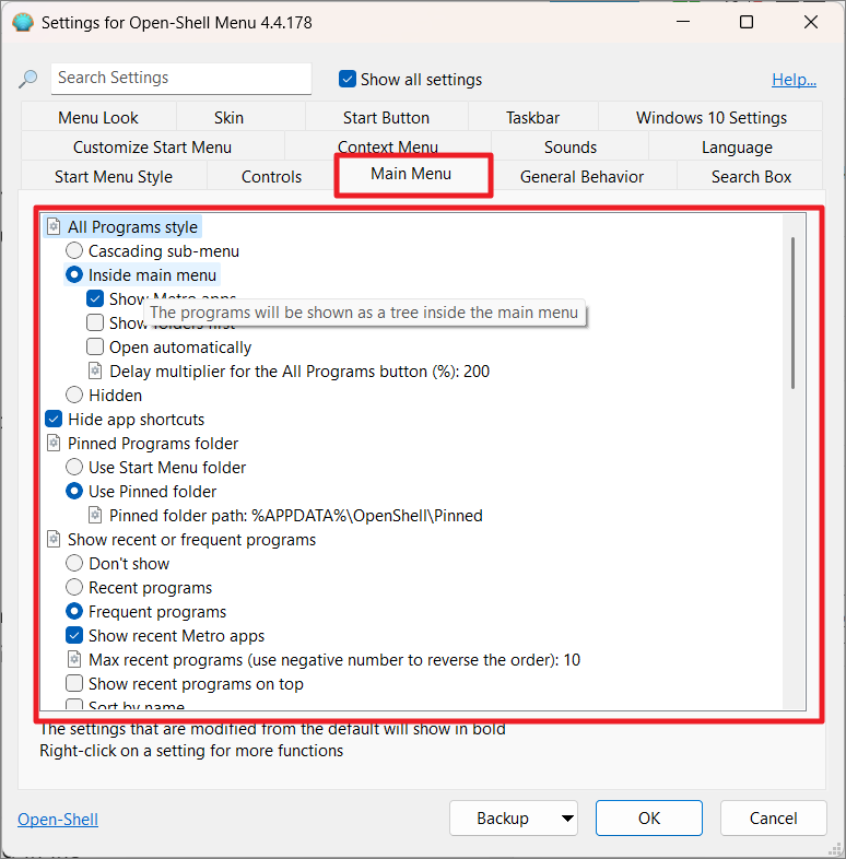 In the ‘Main Menu’ tab, you can fine-tune how different sections of the Start menu function. Options include changing the All Programs style, toggling app shortcuts, configuring pinned programs, enabling jump lists, adjusting pane sizes, sorting items, and setting up shutdown commands.