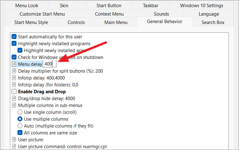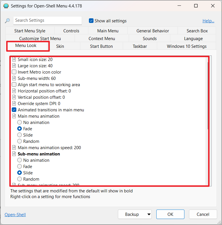 Under the ‘General Behavior’ or ‘Menu Look’ tab, you can customize how the Start menu operates. This includes setting Open Shell to start with Windows, adjusting menu animations, enabling drag-and-drop functionality, and more.