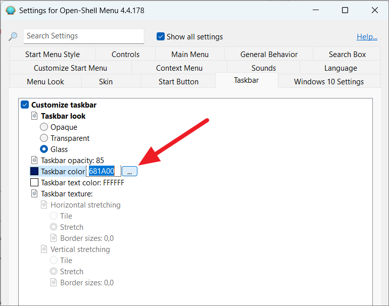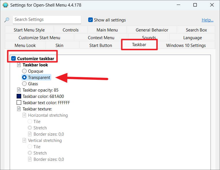 While Open Shell's taskbar customization is limited, you can still adjust its appearance. In the ‘Taskbar’ tab, check the ‘Customize taskbar’ option. Choose a taskbar look: ‘Opaque’, ‘Transparent’, or ‘Glass’.
