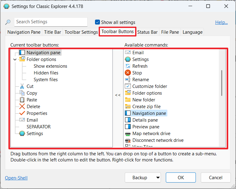 Open Shell also provides customization options for File Explorer. After installation, you'll notice an additional toolbar in File Explorer with new tools.