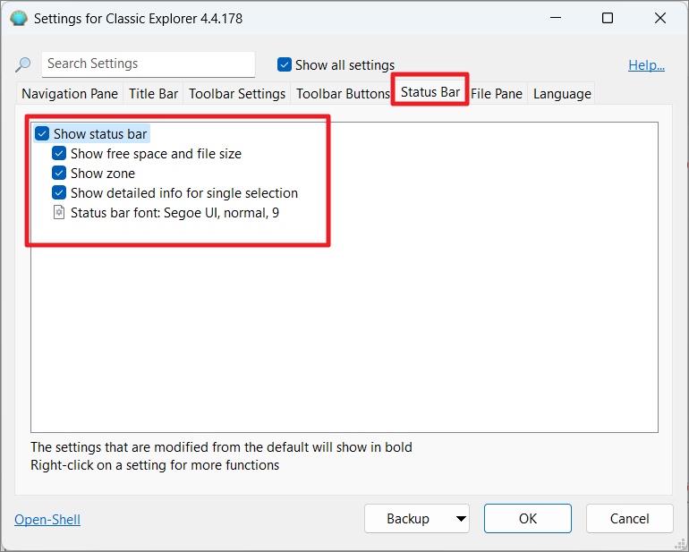 Check the ‘Show all settings’ option to reveal all available settings. You can customize the navigation pane, toolbar buttons, status bar, file pane, and more.
