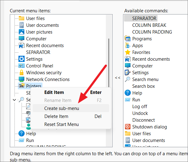 To create a submenu, right-click an item and select ‘Create Submenu’. Drag commands from the right column into the new submenu to populate it.
