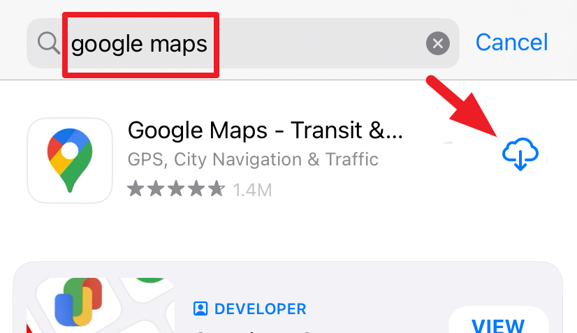 After that, type 'Google Maps' in the search bar and hit 'Search' in the bottom right corner of the on-screen keyboard. From the search results, tap on the 'Get/cloud icon' to download the app on your iPhone.