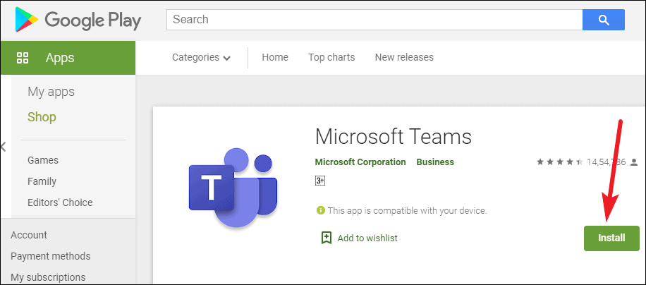 Launch the Play Store on your Chromebook, and search for Microsoft Teams. Then click on the ‘Install’ button.