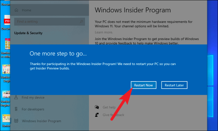 The next step is to restart your system to bind your email address and the system with the Windows Insider program. In order to do so, click the ‘Restart Now’ button present on the ribbon.