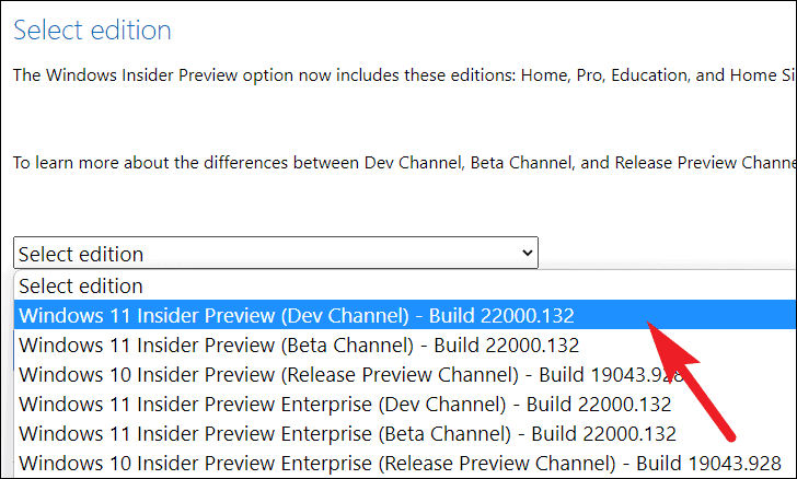 After signing in, scroll down to locate the ‘Select edition’ section on the “Windows Insider Preview Downloads” web page. Then, click on the drop-down menu present under the section and click to choose your preferred build of Windows Insider Preview.