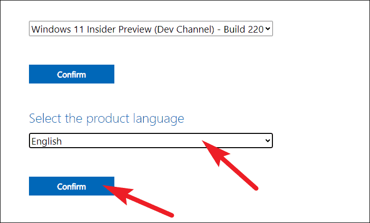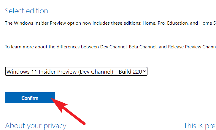 Then, you will be able to see all the available ‘Channels’ depending on your system. Now, click on any of the available ‘Channel’ to proceed further as Microsoft allows even ‘Release Preview Channel’ insiders to download ‘Dev’ or ‘Beta’ build ISOs from the website. Then, click the ‘Confirm’ button to proceed further.