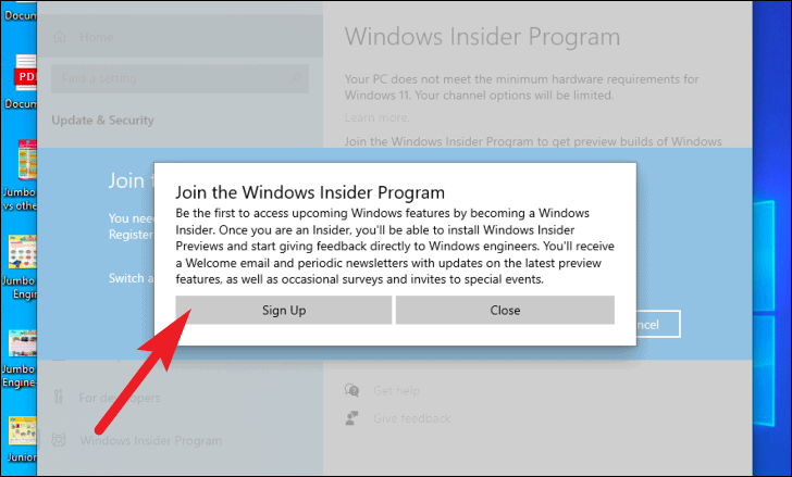 Then, read the information regarding joining the Windows Insider Program and click on the ‘Sign Up’ button present on the overlay window.