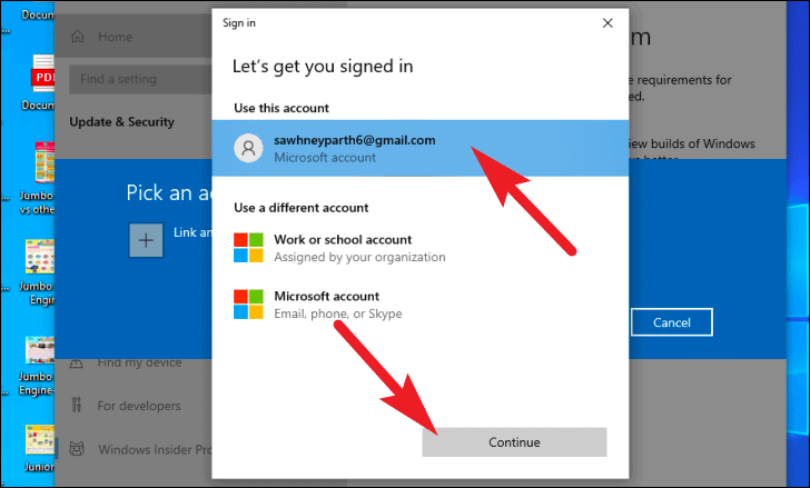 Now, select your Microsoft account and then click on the ‘Continue’ button from the overlay window present on your screen.
