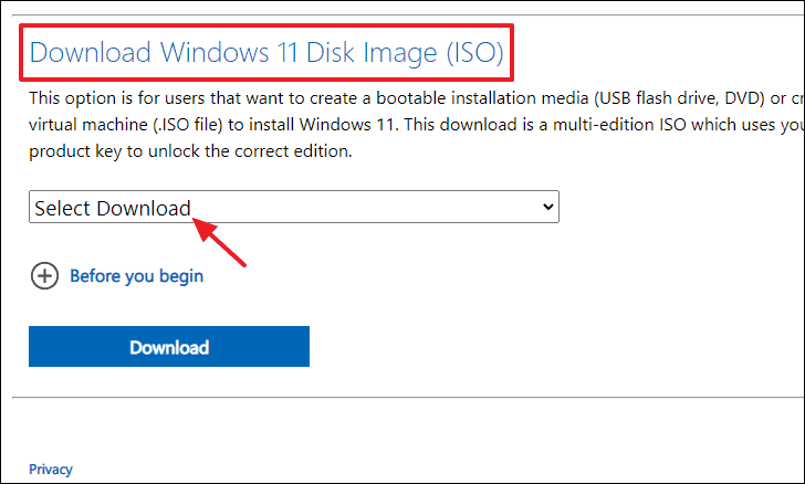 First, go to microsoft.com/software-download/windows11 webpage, and scroll down until you see the ‘Download Windows 11 Disk Image (ISO)’ section. Here, click on the ‘Select Download’ drop-down menu.