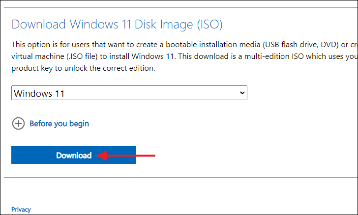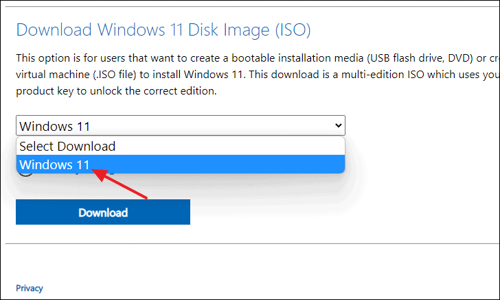 After selecting ‘Windows 11’ from the list, click on the ‘Download’ button below the dropdown menu.