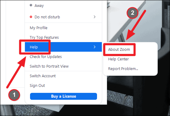 Click on ‘Help’ from the menu that shows, and then select the ‘About Zoom’ from the expanded options.