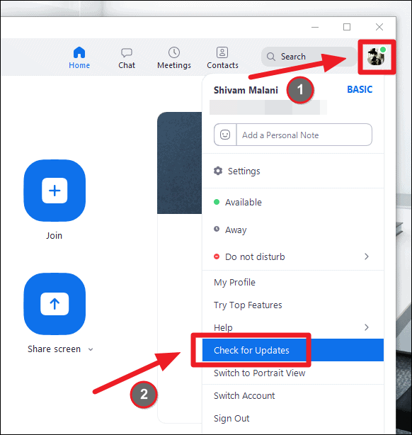 To check for updates in Zoom, click on the profile picture in the Zoom app and then select ‘Check for updates’ option from the menu that shows.