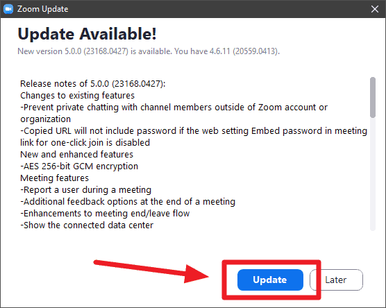 Click on the ‘Update’ button on the bottom right of the window to download and install the Zoom 5.0 update on your computer.