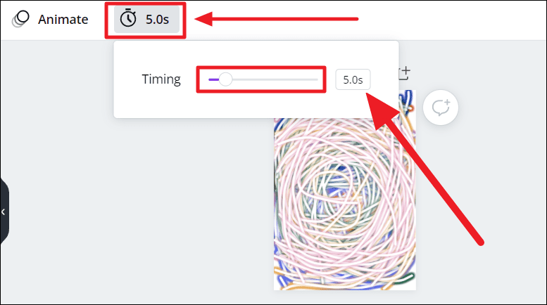 Additionally, you can customize the duration of the animation as well. To do this, deselect the drawing/parts of it, and click the timer icon with 5 seconds. You can either click and drag the toggle along the ‘Timing’ slider or type in the seconds in the box next to it. More the seconds, the slower the animation.