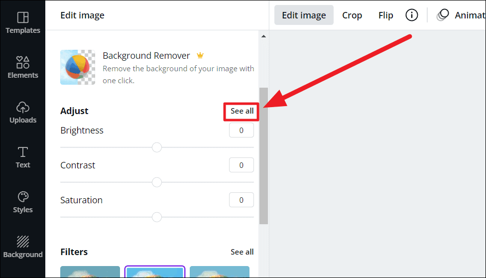 To adjust your drawing, you can either directly manipulate the ‘Adjust’ options (brightness, contrast, and saturation) if that’s all the adjustment options you’re looking for. To view all the ‘Adjust’ options click the ‘See all’ option.