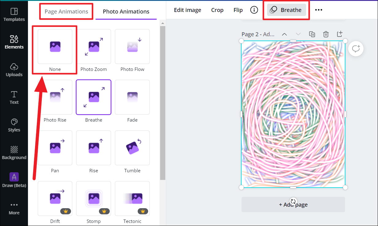Since your drawing is considered as an individual image, you’ll redirect to the list of ‘Photo Animations’ options on the left. To animate the entire page, scroll through the ‘Page Animations’. Click to choose and apply an animation option from either option.