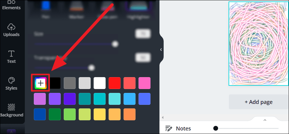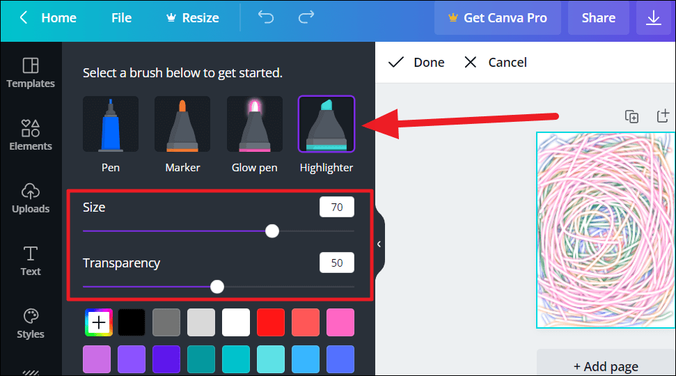 Choose the brush you’d like to use on your canvas – pen, marker, glow pen, or highlighter. You can customize the size and transparency of all brushes. Simply click and drag the toggles along the size and transparency sliders to make your choice. Or manually enter a number in the fields provided next to both aspects.