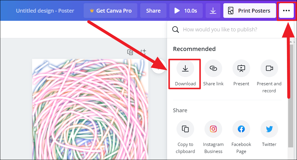 You could also download from the designing screen by clicking the ellipsis icon (three horizontal dots) to the top right corner of the screen and selecting the ‘Download’ button from the drop-down menu. This would open the same download box as shown above.