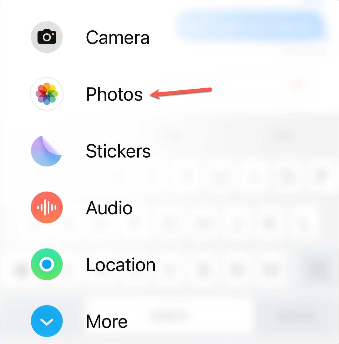 Step 2: Open the iMessage conversation with your friend. Tap the '+' icon at the bottom left to access the app drawer, then select 'Photos'.