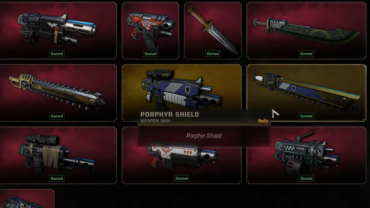 The main requirement is a Porphyr Shield weapon skin. These blue-tinted skins are available for the bolt rifle, bolt pistol, chainsword, and power axe. If you've played since launch, you likely received at least one of these skins for free through Twitch drops or earlier promotions. If you don't have one, you can purchase the bolt rifle or chainsword versions from the Armory for 500 Requisition Points each.