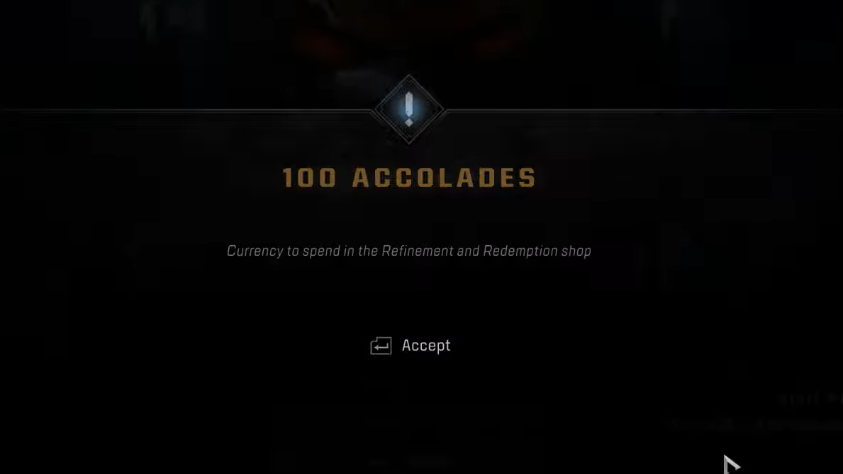 Accolades are a cosmetic-focused currency. You spend them in the "Refinement and Redemption" shop on your Battle Barge to unlock Heroic Weapons and cosmetic items. Each Heroic Weapon costs 300 Accolades, so this event's 100 Accolades covers roughly one-third of a weapon unlock.