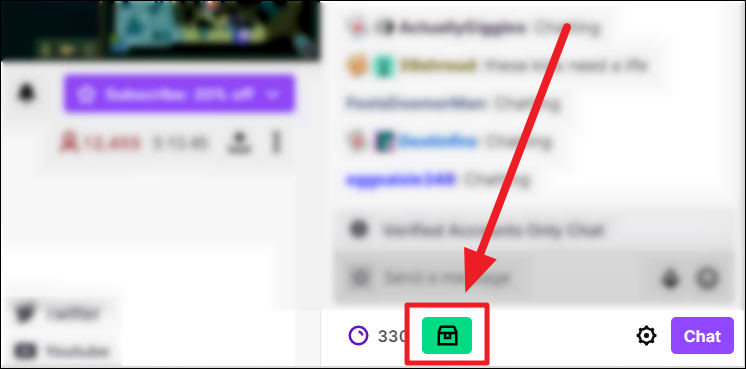 Look to the bottom of the stream chat to locate a coin-like animation with the number ‘0’ next to it. This is the ‘Channel Points’ button. Click this button. The channel points button can look like and be called anything apart from a coin — depending on the streamer’s customization. It all works the same, nonetheless.