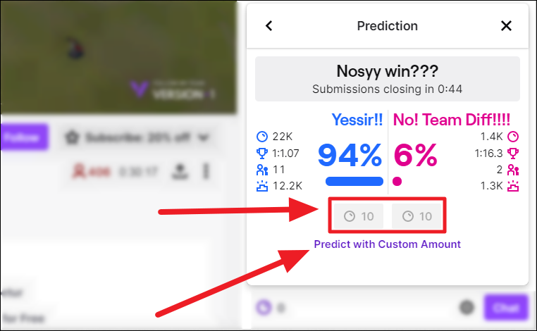 So, you can either click/tap the channel point button with the number of CP required to vote for either side or use a custom number of channel points. If you want to predict with the latter, click/tap the ‘Predict with Custom Amount’ below the CP buttons.