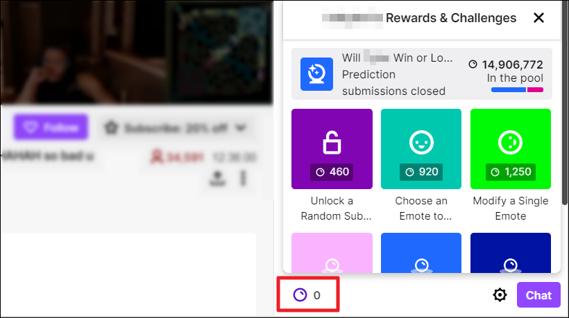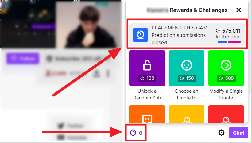Or click the same ‘Channel Points’ button at the bottom of the stream chat. Now, if you see a section with a crystal ball at the top of the ‘Rewards and Challenges’ box right below the title, click it.