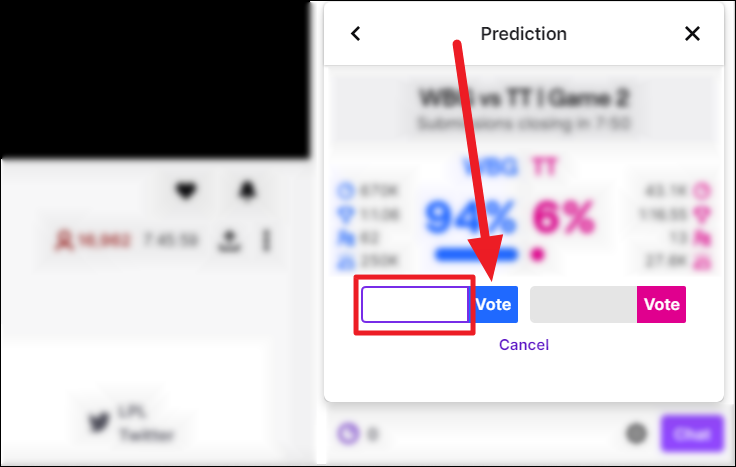 Next, enter the custom amount of channel points you want to predict with and hit ‘Vote’ on the respective side. If you don’t want to vote with custom CP, click ‘Cancel’.