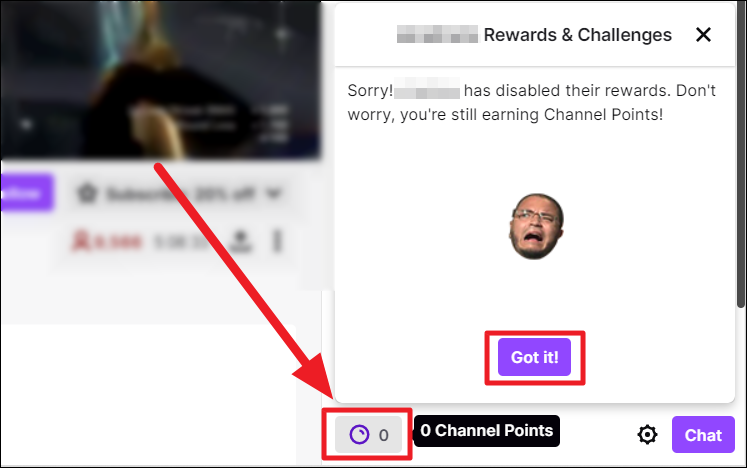 If you see that the streamer has disabled rewards, then you wouldn’t earn channel points conventionally on this stream. Hit ‘Got it!’ and move onto either watching the stream or exiting it.