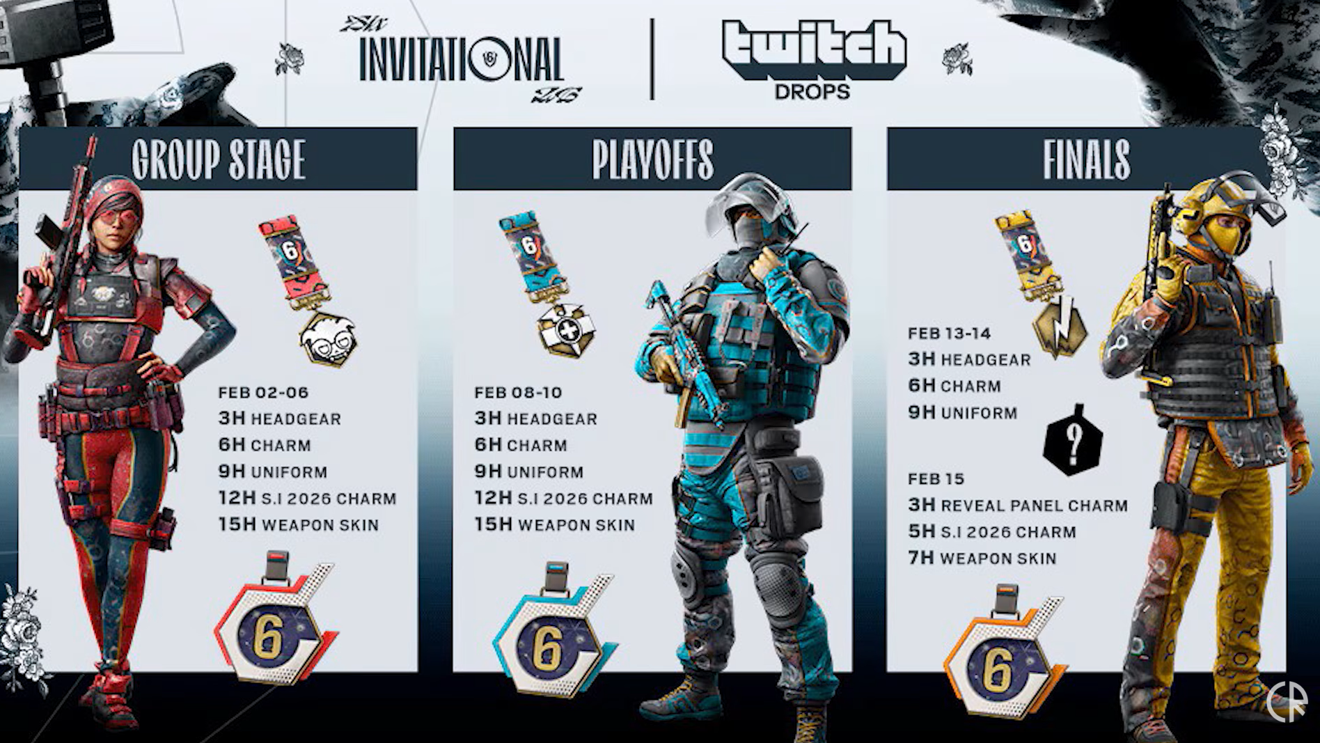 The Six Invitational 2026 runs from February 2 through February 15, and Ubisoft has loaded the event with Twitch Drops that reward viewers with exclusive in-game cosmetics for Rainbow Six Siege. Three operator-themed sets rotate across the tournament's Group Stage, Playoffs, and Finals, each requiring specific watch-time thresholds to unlock headgear, charms, uniforms, and weapon skins.