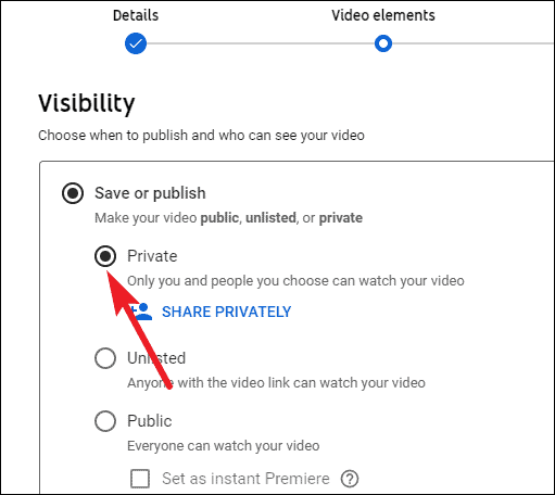 Then, under ‘Save or Publish’, select the option ‘Private’. This is crucial unless you want to make the video visible to everyone.