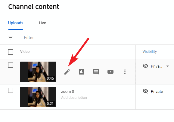 The video will appear on the Channel content page. Hover over it to reveal more options and then click the ‘Details’ button.