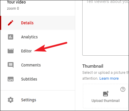 Video details will open in the YouTube studio. Go to the navigation menu on the left and click ‘Editor’.