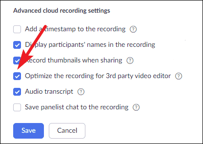 Under Advanced cloud recording settings, check the option for ‘Optimize the recording for 3rd party video editor’ and click ‘Save’.