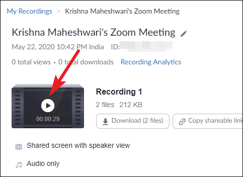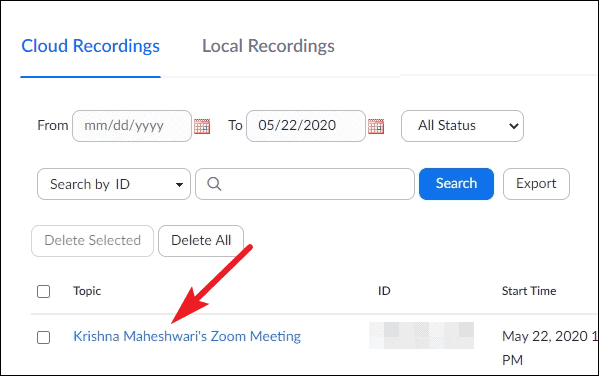 The tab for Cloud Recordings will open. Click the meeting topic for which you want to view the recording.