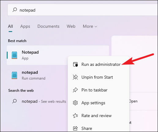 Notepadin the search bar, then right-click on the Notepad app and select Run as administrator.