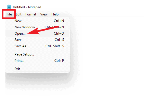 - In Notepad, click on the File menu and select Open, or press Ctrl + O on your keyboard.