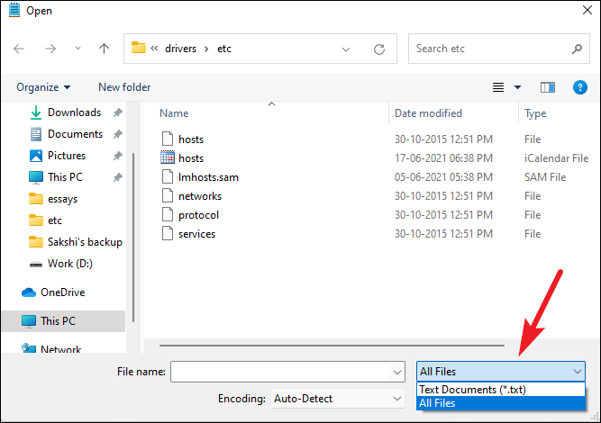 C:\Windows\System32\drivers\etcby expanding the folder tree on the left or typing the path into the address bar. - Change the file type filter from Text Documents (*.txt) to All Files to display the