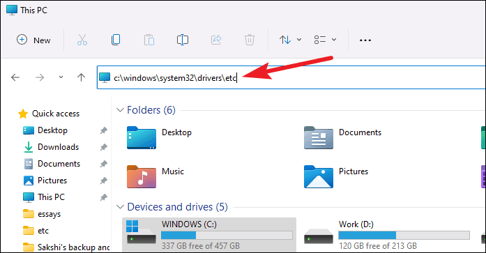 Open File Explorer and navigate to the C:\Windows\System32\drivers\etc directory. If your Windows installation is on a different drive, replace C: with the appropriate drive letter.