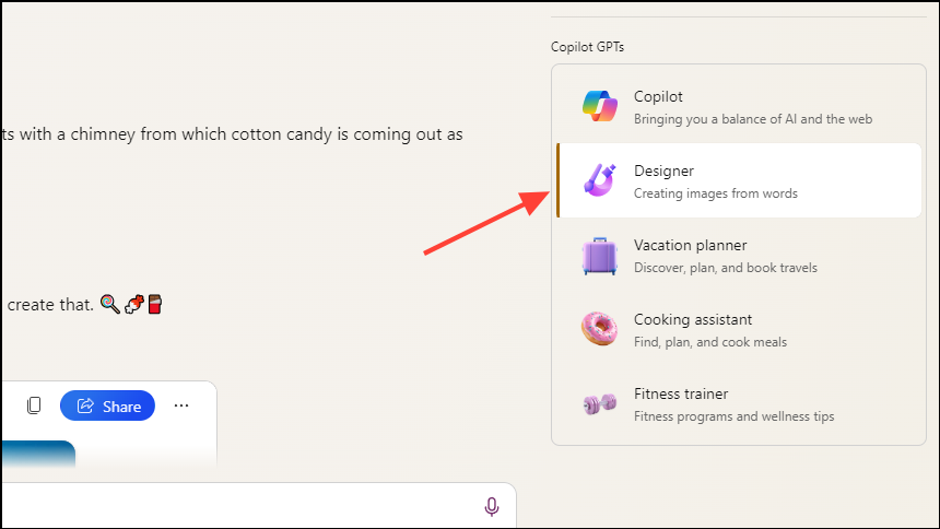 - After signing in, you will be able to see the available Copilot GPTs in a panel on the right side of your screen. Select the 'Designer' Copilot used for AI image generation by clicking on it.