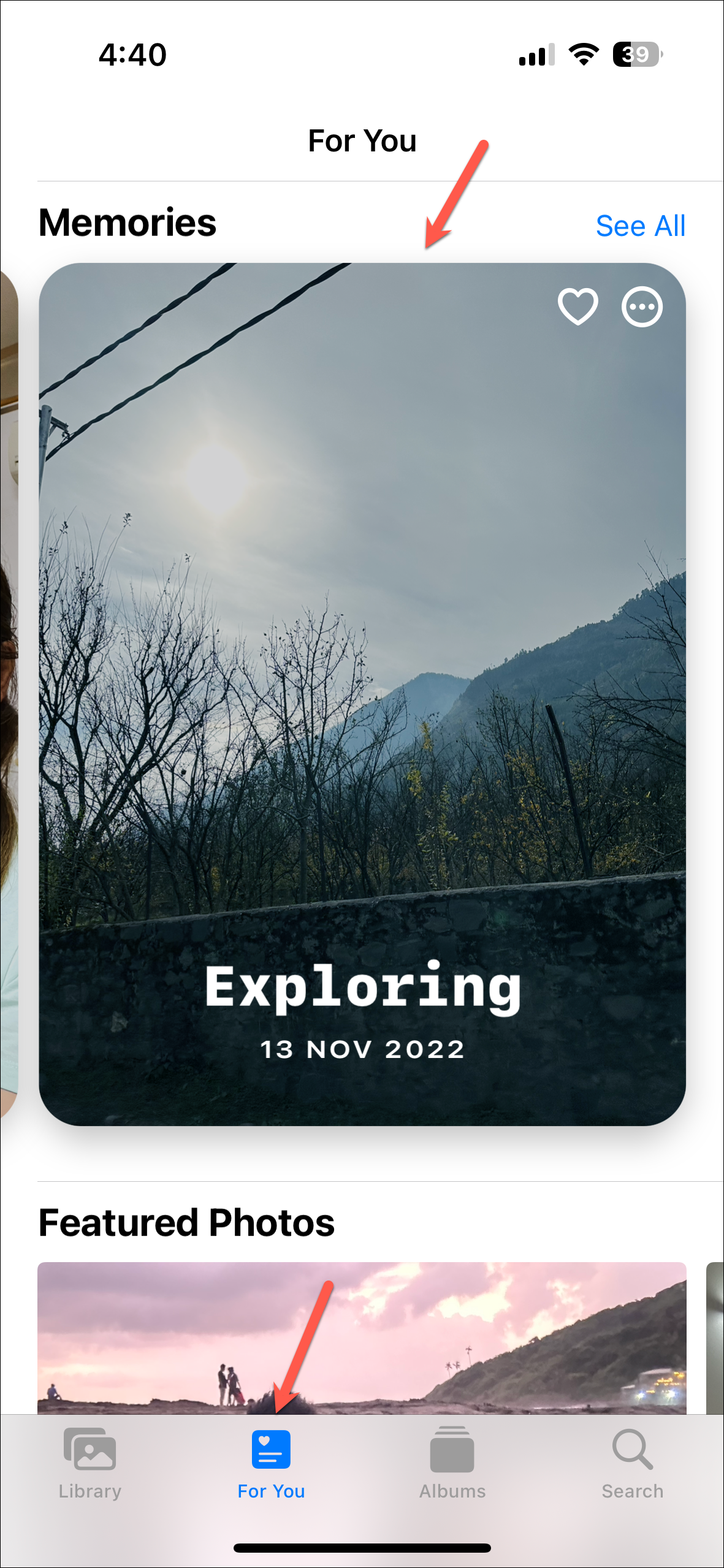 - Head to the Photos app and tap the 'For You' tab. Next, tap on the 'Memories' tile you wish to edit.