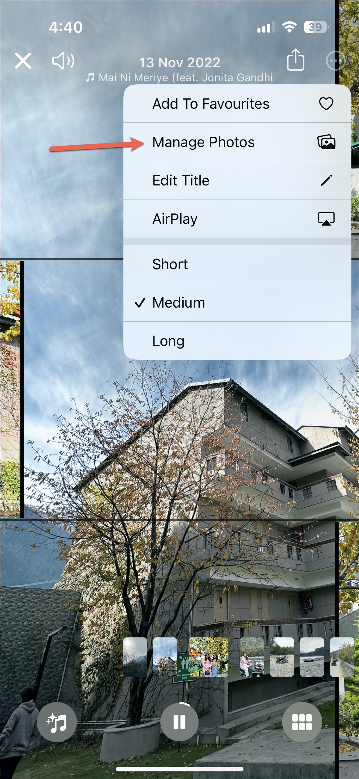 - Open the memory, tap on the three-dot menu icon, and go to 'Manage Photos'.