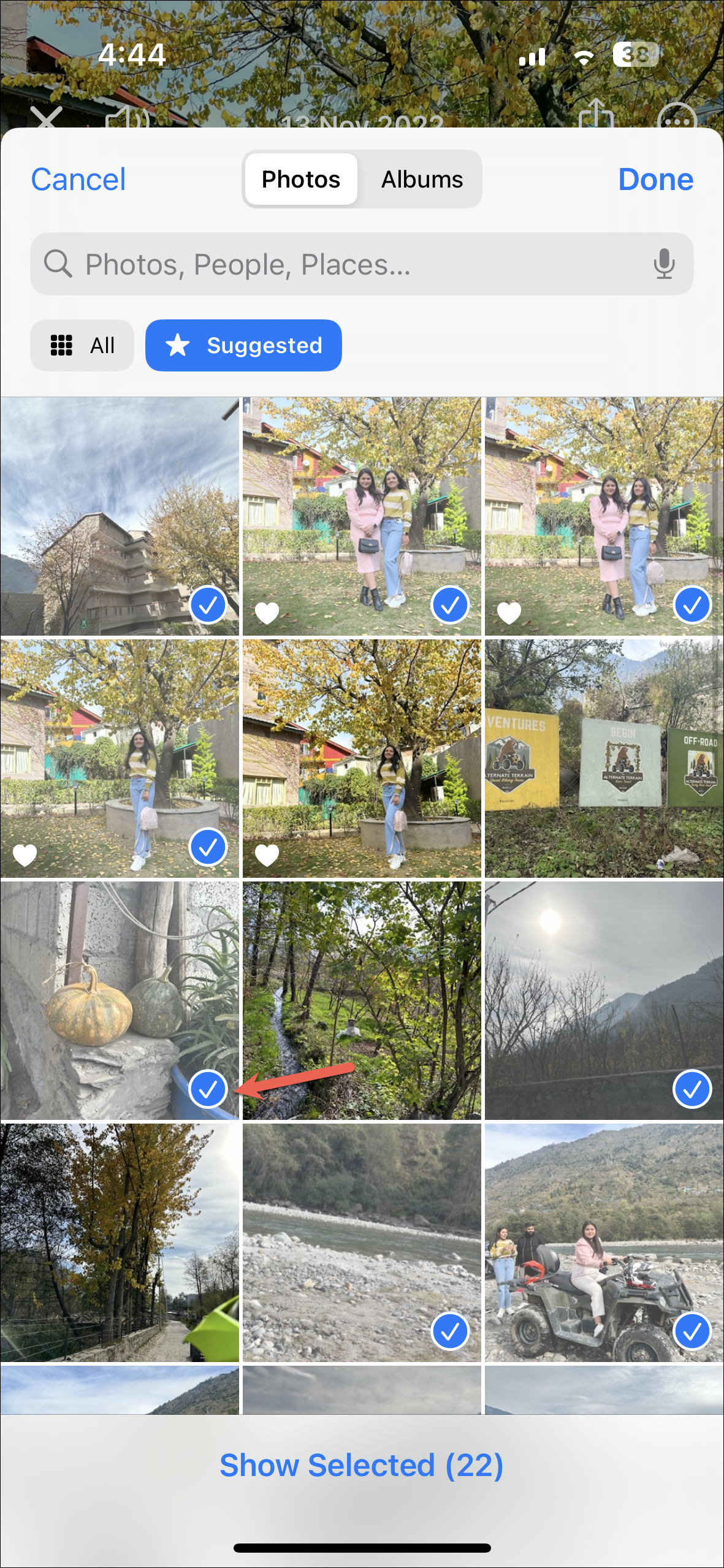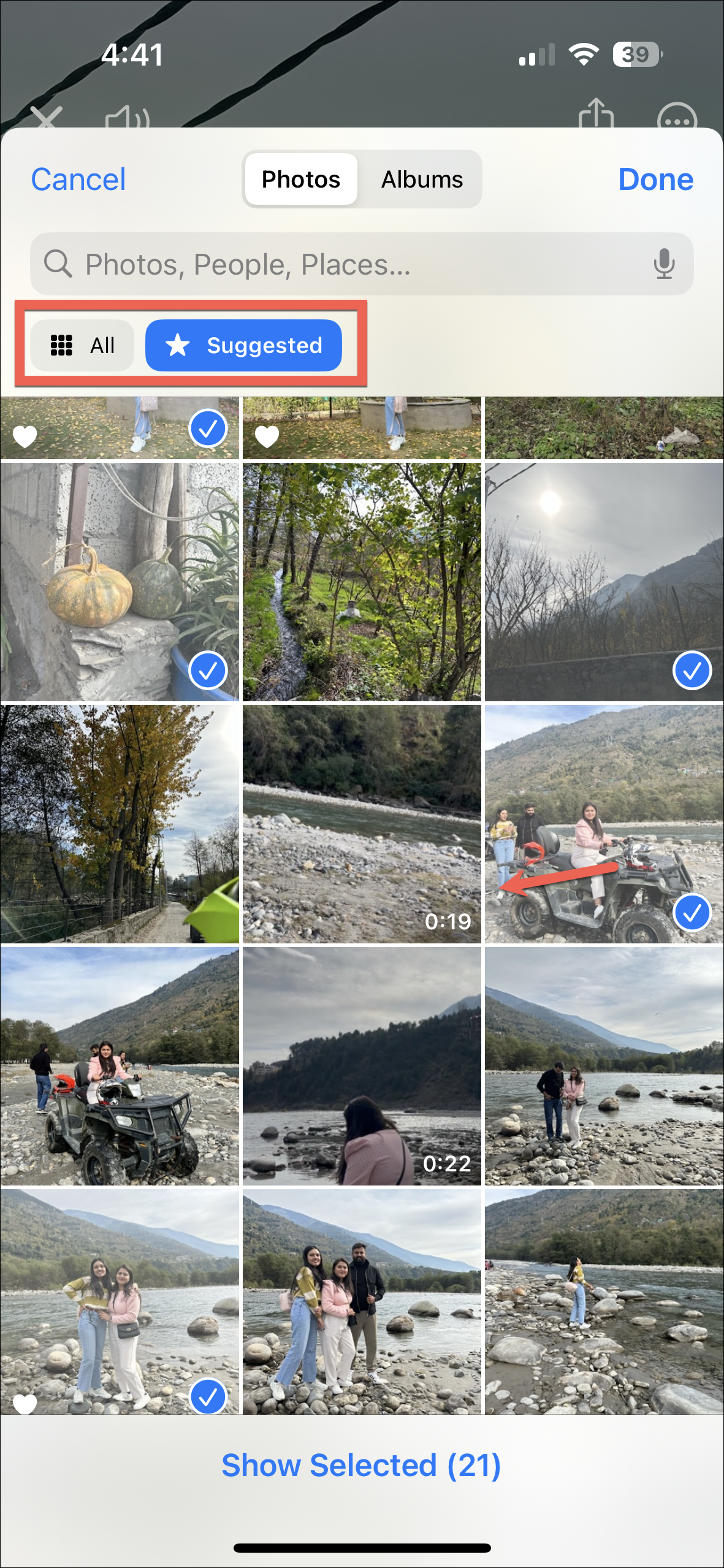 - After that, navigate to the photo/ video you wish to select and tap on its thumbnail. If the item you wish to include is not in the 'Suggested' section, switch to the 'All' tab from the top and then select the desired photo/ video.