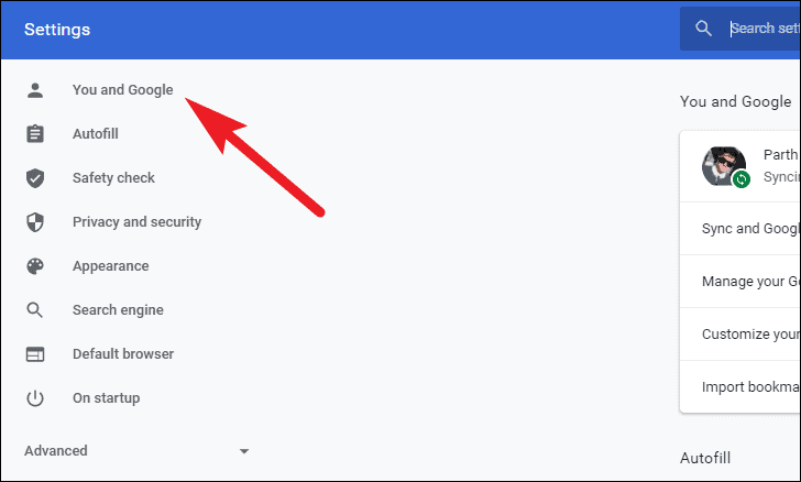 Step 1: In Chrome's settings, navigate to 'You and Google' as described earlier.
