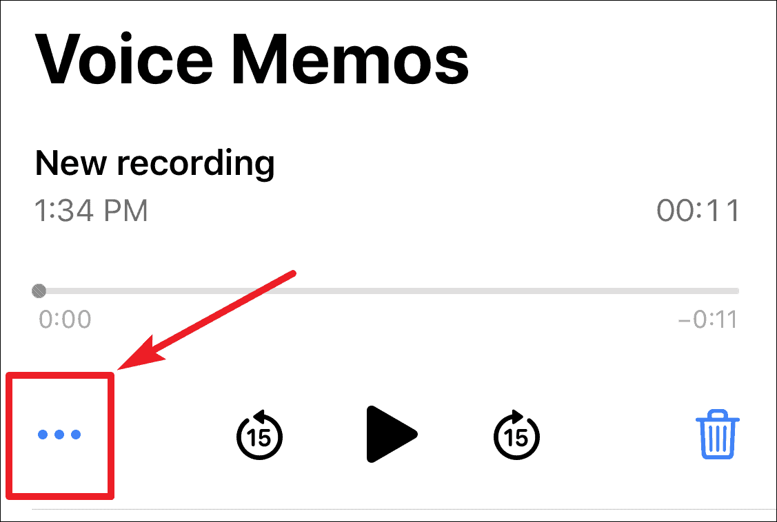 When you tap a recording, a UI will expand underneath it. Along with play, and delete options, there will be a ‘More’ option (three dots) on the left. Tap on it.