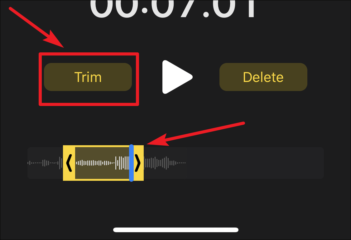 To trim the memo, place the left handle of the slider at the part from where you want the memo to begin, and the right handle where you want it to end. Then, tap the ‘Trim’ button. Only the memo within the slider will remain and rest will be deleted.